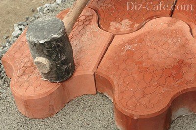 Якщо грунт на дачі схильний пученію, то краще бетон замінити тротуарною плиткою, тому що в цьому покритті будуть зазори, які не дадуть майданчику жолобитися. До того ж, волога з плиток швидше випаровується. Плитку укладають на піщано-цементну подушку або на щільно утрамбовану щебінку, придавлюючи до основи гумовою киянкою.