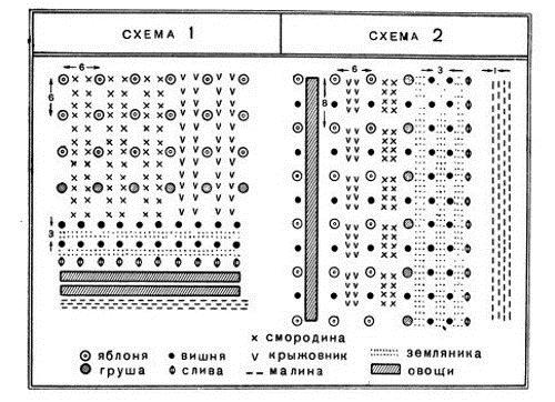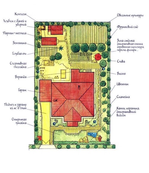 По периметру ділянки (межі з 3-х сторін) можна посадити плодові чагарники: шипшина, малину, смородину, обліпиху або висадити декоративні дерева. Справа в верхньому кутку виділіть місце для вирощування городніх культур, а щоб відокремити кордон між городом і фруктовим садом, посадіть ряд яблунь. По сусідству із зоною відпочинку з правого боку ділянки будуть себе чудово відчувати фруктові дерева: вишня і слива, а в тіні цих дерев можна поставити лавку, щоб відпочивати в полуденну спеку. Суниці, полуниці, троянди та інші квіти можна посадити з протилежного боку ділянки, щоб ці рослини не заважали іншим.