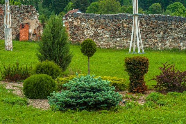 Велике вільне простір в центрі саду вимагає відповідного оформлення кордону. Як акцентів можна використовувати вічнозелені дерева і чагарники. Головне, дотримуватися правила пропорцій. Високі і розлогі дерева доречні на великій території. Для оформлення маленьких ділянок краще використовувати низькорослі культури або карликові форми рослин.
