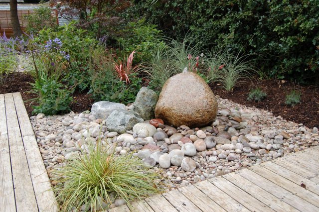 Кам'яна огорожа клумб і дерев виглядає солідно і гармонійно незалежно від того, який тип породи був використаний при її спорудженні. Гладкі валуни пом'якшать прямі лінії, а нерівно відламані скельні породи зроблять композицію більш монументального.