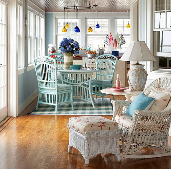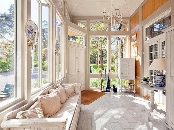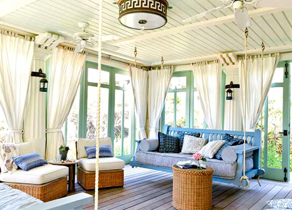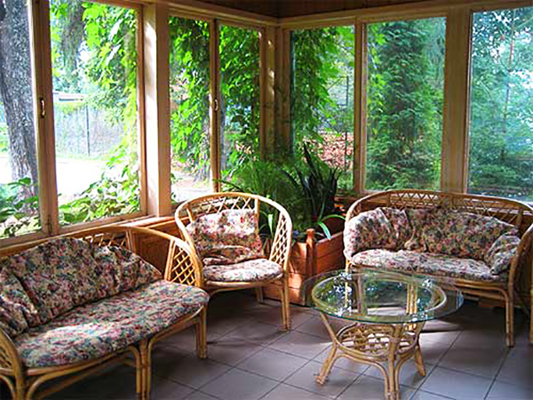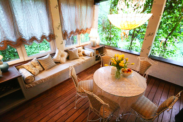 Створювати інтер'єр веранди набагато простіше, тут вже ми не прив'язані до клімату, все обстановка буде знаходиться під дахом, тому ми можемо собі дозволити дизайнерські вишукування.