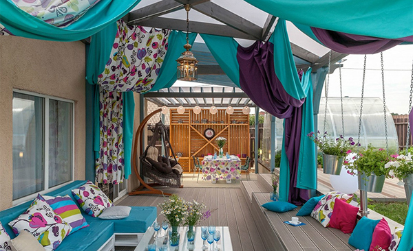 Дизайн тераси можна створити просто чудовим, з красивою плетеними меблями, затишними дачними столиками, яскравими подушками, пледами і атмосферних освітленням.