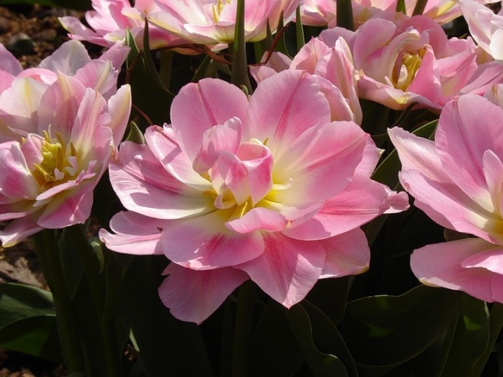 Група тюльпанів Тріумф. Квітки високі, великі, келихоподібних. Середньоранні, цвітуть від 10 до 20 днів переважно в другій половині травня. Більшість сортів цієї групи має світлу облямівку на квітках. Кращі сорти: Авіатор, Альгіба (лілово-рожевий, злегка малиновий), Каррата (білий і карміново-червоний, має сріблясту облямівку), Флеймінг Прапор (білі з лілового облямівкою), Leen van der Mark (червоні з кремовою облямівкою).
