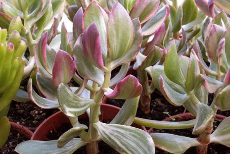 Пестролистная форма крассули Обліква. Максимальна висота рослини – 1, 5 метра. Листя закруглені, з чітко забарвленими краями, відтінок канта може бути корисним або яскраво-рожевим. Пластина біля основи світло-зелена, а ближче до середини темна з нерівними білими смужками.