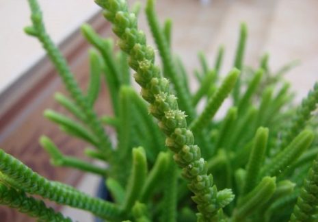 Спочатку стебла цих рослин прямостоячі, у міру зростання вони нахиляються, але кінчики залишаються спрямованими вгору. Дрібні гострі листочки-лусочки складені дуже густо, буквально обліплюють тонкі стеблини, за рахунок чого вони набувають чотиригранну форму. Висота рослин від 25 до 100 см. Якщо квітка коштує на сонячній стороні і протягом дня отримує максимальну кількість світла, листя набувають червонуватого відтінку.