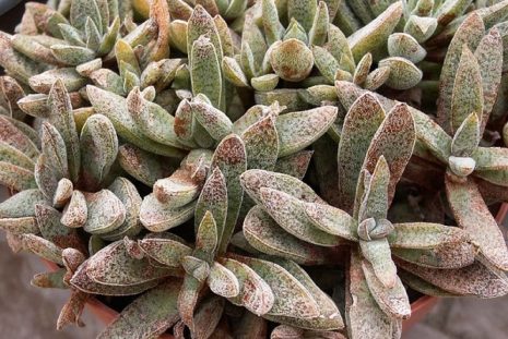 Невеликий кущик (до 15 см у висоту) з щільною дуже товстими, кілеватие, трикутними в перерізі листям, які розташовуються не стеблі чешуйчато. Пластина сіро-зелена з борошнистою поверхнею. Взимку різновид цвіте рожевими, ароматними квітками, зібраними в пухких парасольках. Оманлива толстянка – ще одна назва різновиду.