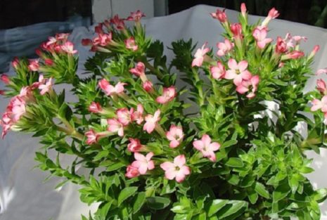Цвіте різновид ніжними білими або злегка бузково дрібними квітками в густих парасольках. Цікава особливість – пари листя ростуть під прямим кутом до попередніх.