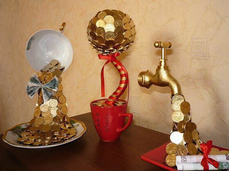Насправді все дуже просто. Грошовий топиарий обійдеться не дорожче, ніж деревце з паперових квітів. Адже ніхто не говорить про використання справжніх грошей. Вони будуть склеюватися, м'ятися, надрізати, в загальному, прийдуть в непридатність, якщо їх спробувати відокремити від топіарія. Тобто такі гроші потім використовувати буде проблематично. Тому для роботи над грошовим топіарі завжди беруть бутафорію.