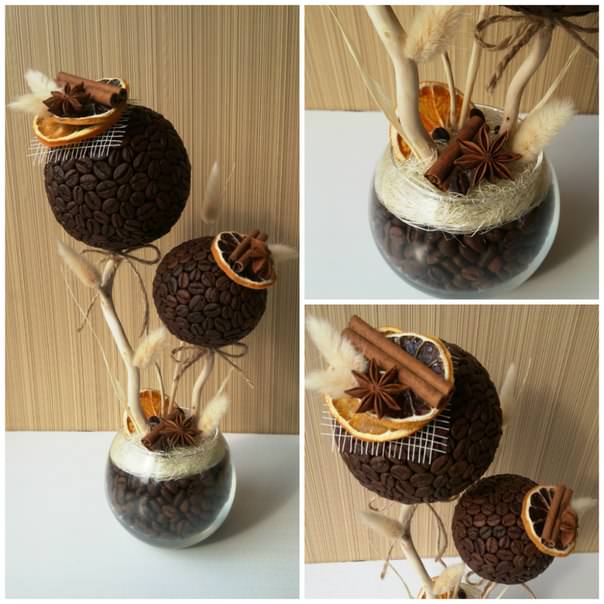 Обсмаженими зернами кави можна прикрасити будь-які саморобні вироби: міні-ароматизатори для машини і будинки, картини і панно, статуетки та іграшки. Але особливо часто їх використовують для виготовлення топіарі, які часто називають деревами щастя. Ці милі вироби легко вписуються в будь-який інтер'єр і не тільки прикрашають приміщення, але і ароматизують його, поширюючи навколо підбадьорливий запах свіжозвареної кави.