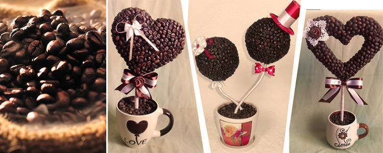 Топіарії з кавових зерен – ефектні аксесуари, які можна подарувати або використовувати для прикраси власного будинку. Виробу легко надати форму кулі, квітки або серця, поекспериментувати з аксесуарами і підставками. Топіарії з кавових зерен можуть бути мініатюрними або дуже великими, що досягають 1 метра у висоту.