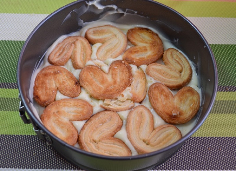 Настав час збирати торт – візьміть печиво вушка, занурюйте кожне в крем і укладайте на блюдо з високими бортиками. У мене це роз'ємна форма для випічки. Рекомендую печиво щедро вмочати в кремі. Чим більше крему, тим смачніше!