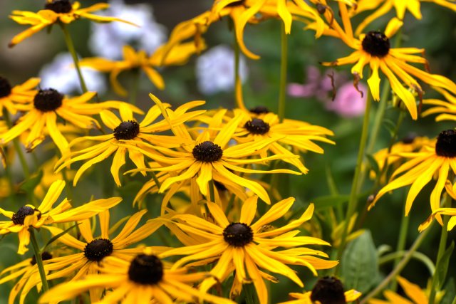 Добра знайома якщо не всіх, то дуже і дуже багатьох власників дачних ділянок. Її яскраві жовті пелюстки вигідно відтіняє насичена темно-коричнева серцевина. Рудбекия однаково ефектно виглядає як в моноклумбах, так і в поєднанні з айстрами, дельфініум, кореопсис і біло-блакитними флоксами.