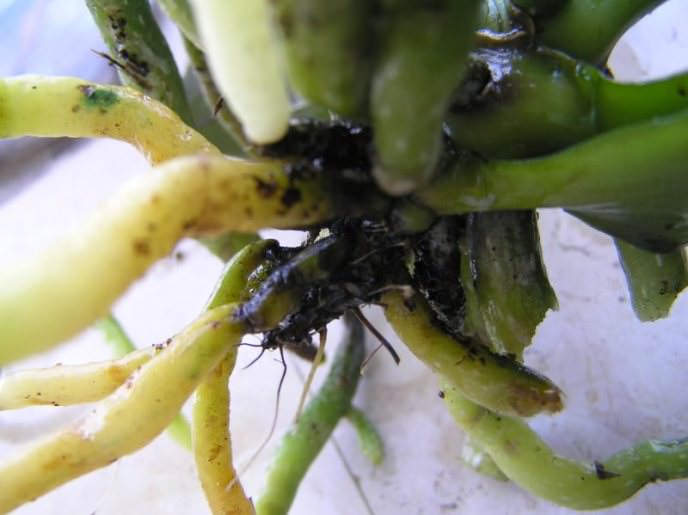 Якщо квітникар, що вирощує орхідею, зауважує, що коріння рослини набуває бурого або чорне забарвлення, а верхній шар знімається і при натисканні на нього відбувається виділення рідини, то мова йде про те, що коренева система згнила, і необхідно терміново вжити заходів.
