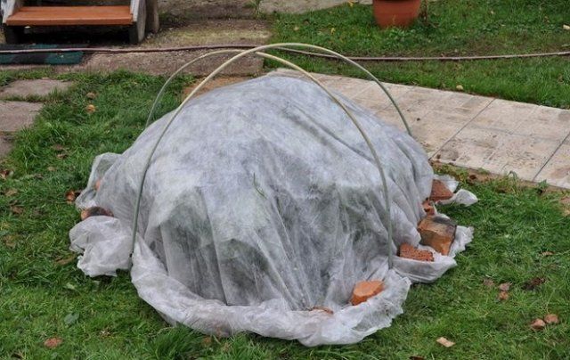Накиньте на кущ 1-2 шари спанбонду і притисніть краю матеріалу камінням або цеглою