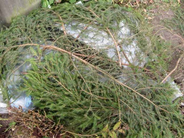 Привчати рослина до горизонтального положення необхідно поступово, через деякий час переміщаючи скоби-фіксатори від центру стовбурів до їх основи. Пагони слід утеплити ялиновим гіллям, а поверх нього – спанбондом. Зверху треба насипати сухі тирсу або торф, а потім знову лапник.