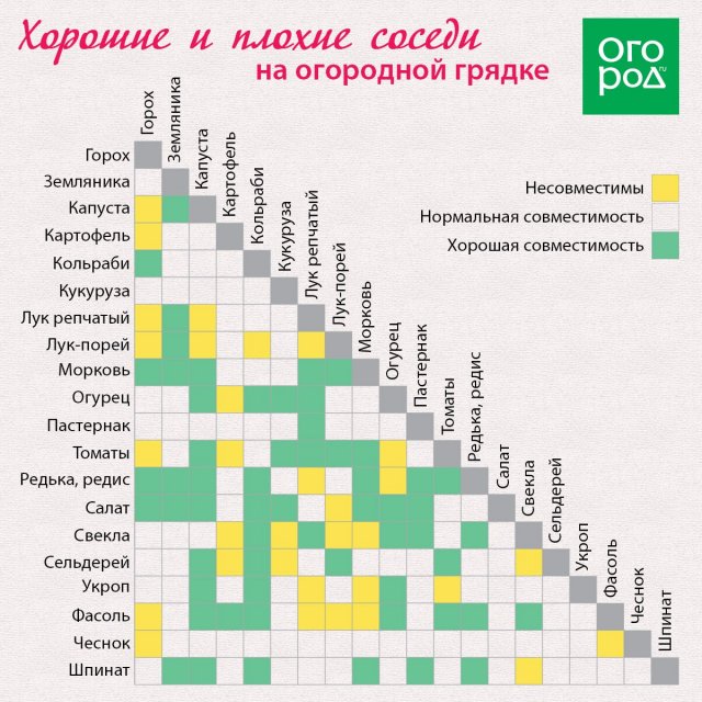 Наприклад, світлолюбні невисокі буряк і горох будуть погано себе почувати в тіні більш високих і "крислатих" родичів – значить під ними краще посадити тіньовитривалі цибулю, кріп, салат.Не дуже затишно буде поруч один з одним близьким представникам одного і того ж сімейства – їх сусідство майже обов'язково забезпечить всі рослини однаковим "набором" хвороб (приклад – посаджені поруч з родичами пасльонові або зонтичні).