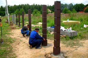 Складні в монтажі, високодекоративний. Закапувати такі опори вміють лише досвідчені фахівці, через що зведення паркану сильно дорожчає. Перед установкою обладнується фундамент, який сприйме все навантаження від важких опор. Правильність виконання монтажу багато в чому визначає довговічність. Якщо стовпи перекошуються, Потрібно реконструкція огорожі.