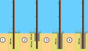 Буром ями, якщо висота опори більше 2 м, робляться приблизно 80 см глибиною, внизу робиться розширення, яке заливається бетоном. Стінки зміцнюються рубероидной трубою, яка повинна виступати на 15 см. Навколо цієї виступаючої частини робиться дерев'яна опалубка. Яма в повному обсязі заповнюється бетоном. Поки розчин ще не застиг, вставляється залізний прут або штир, чия довжина трохи менше, ніж у самого стовпа.