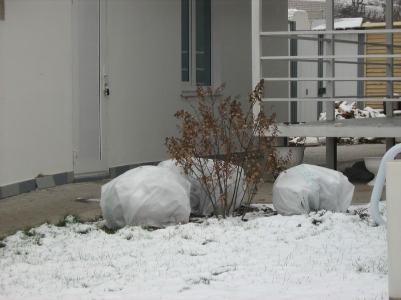 Багато квітникарі НЕ пригинають гілки чагарника до землі, а просто щільно їх стягують за допомогою шпагату або капронової мотузки, після чого декоративний кущ огороджується каркасної конструкцією на основі пластикової чи металевої сітки.Всередину такого споруди насипається теплова прошарок, в якості якої можна використовувати суху опале листя. Зовні виконана захисна конструкція обертається щільними, але дихаючими укривними матеріалами.