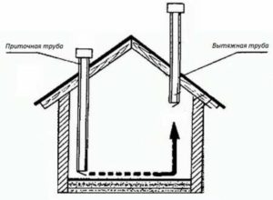 - під час установки покрівлі необхідно залишити два круглих отвори для труб. Нижня труба – для припливу повітря в приміщення (тяга), верхня – для виведення (витяжка). Нижня встановлюється далеко від пташиних сідало, а верхня – майже над ними; Пристрій припливно-витяжної системи вентиляції в курнику: схема наочно показує рух повітряних потоків