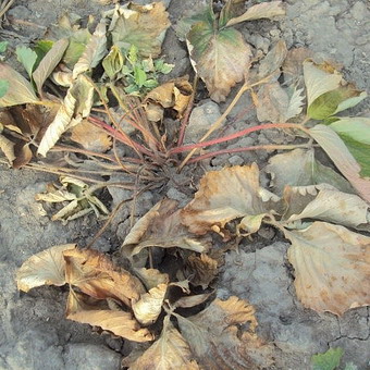 - в'янення фітофторозних – зелене забарвлення листових пластин поступово стає сірою, живці та листяна розетка стають червоними. Рослини припиняють рости, а їх коріння відмирають.