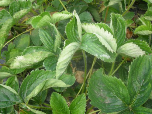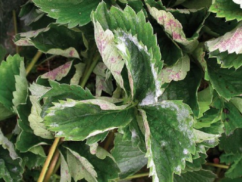 - Мучниста роса – листя скручуються в трубочку і фарбуються в фіолетовий колір. Поверхня пластини покривається легким білястим нальотом. Хворі кущі погано запилюються, а на тих, що запилюючи, ростуть деформовані ягоди.