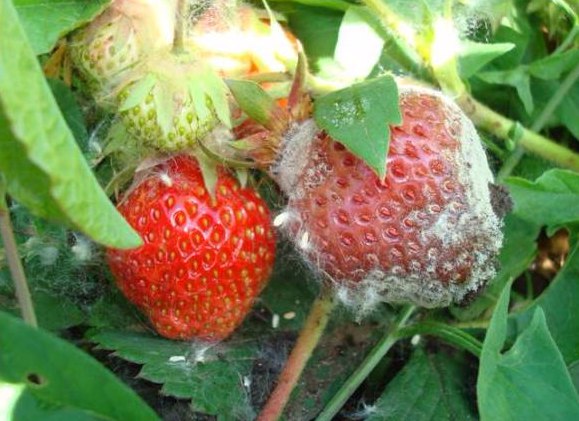 - сіра гниль – небезпечне грибкове захворювання, яке за короткий час може погубити все плоди. На ягодах проявляється у вигляді сірих плям, покритих легким пухнастим нальотом. Вражений плід разом з плодоніжкою засихає, а листя покриваються сірими плямами.