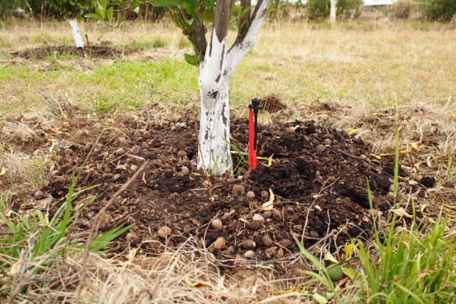 - Фарбування стовбура потрібно закінчувати з урахуванням 4-6 сантиметрів в глибину, для чого звільнити низ штамба від землі. Після побілки шар грунту повернути на місце.