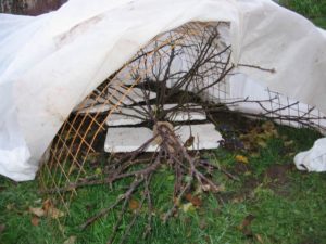 Основу куща потрібно підгорнути сухою землею на висоту 40 сантиметрів, потім зверху засипати сухим листям або закрити ялиновими гілками.
