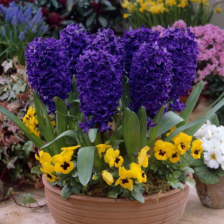 - яскраво-сині, фіолетові і блакитні різновиди, наприклад, сорти раннього цвітіння Дельфт блю, Марі, Аметист, Анна-Ліза, а також гіацинт Ріго, махрові Сапфір і Кінг Кодро пізнього цвітіння, мають цибулини з зовнішньої лускою різних відтінків фіолетового відтінку;