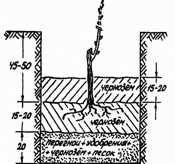 Розмістивши саджанець в ямі, слід розправити кореневу систему, засипати її грунтовою сумішшю і обережно утрамбувати ґрунт руками. На заключному етапі посадки проводиться полив і виконується прив'язування саджанця до опорного кілка для правильного росту і розвитку виноградної лози.