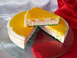 - Очищений апельсин нарізати шматочками, прикрасити торт, залити його желе (розвести згідно інструкції).