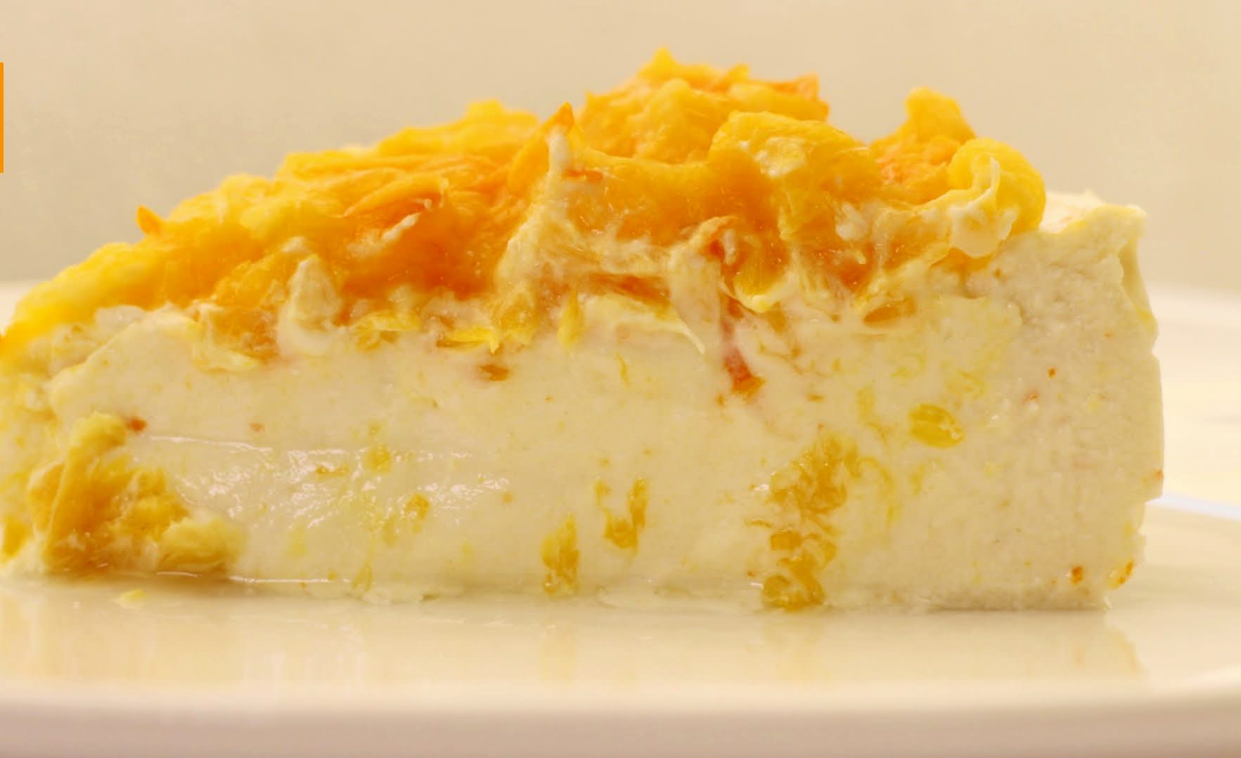- З апельсина зчистити шкірку і плівки, прибрати кісточки. Збити фрукт з цукром, що залишився і крохмалем в блендері і вилити на сирну поверхню.