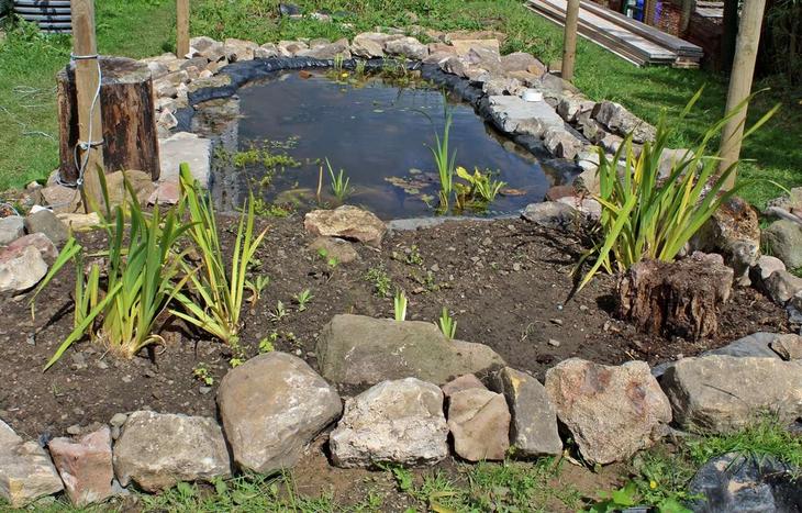 Простіший варіант – спорудити водоймище зі старої ємності (таза, корита, ванни), яку слід вкопати в землю. По краях саморобної ставка висаджують рослини, кладуть камені.