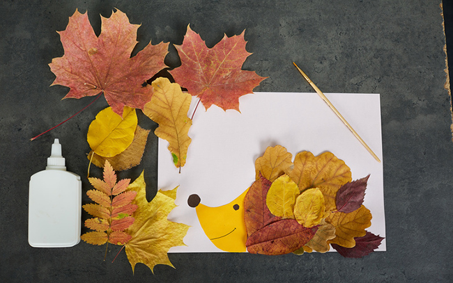 тварини. З кольорового паперу вирізаємо мордочку їжака, ніс і око, приклеюємо до листу. За допомогою клею ПВА прикріплюємо листя, формуючи тіло звірка. Для збереження зверху скроплюємо звичайним лаком для волосся. Не обмежуйте уяву: можна вирізати тулуб рибки і обклеїти її листям, імітуючи лусочки.