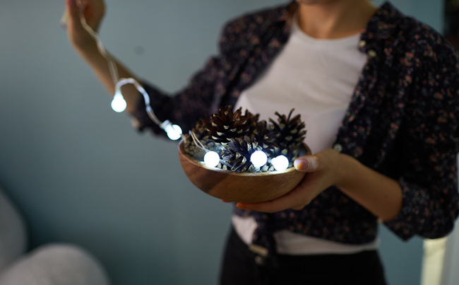 Решта шишки можна скласти в скляний або дерев'яний ємність разом з гірляндою: вийде осінній нічник для м'якого і приємного освітлення кімнати.