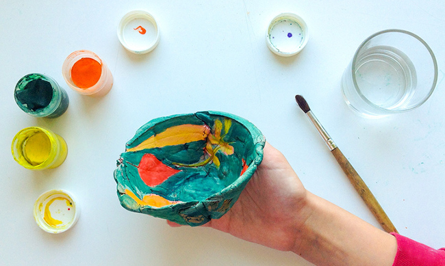 Коли тісто затвердіє, знімаємо його з тарілки, акуратно видаляємо з тіста листочки: важливо, щоб пропечатали їх прожилки. Тепер зафарбовуємо окремо рельєфи листя, окремо фон. Як тільки фарба висохне, робота готова. Тісто можна замінити глиною: тоді саморобну тарілочку можна потримати деякий час в духовці, щоб обпалити, і потім використовувати як звичайний посуд.