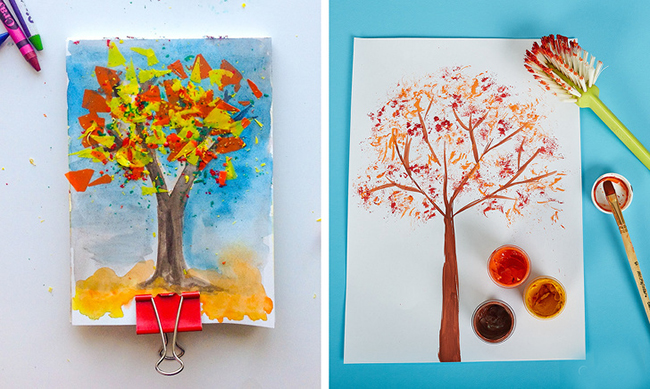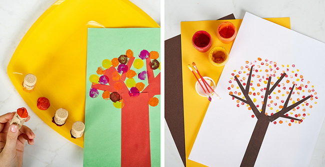 Вирізаємо коричневі гілки і стовбур дерева з кольорового паперу, приклеюємо до листу. Щоб намалювати листя, кінчики винних пробок або ватяні палички занурюємо у фарбу і точково торкаємося паперу. Не бійтеся експериментувати: замініть палички і пробки шматочками губки або зім'ятою папером, спробуйте малювати пальцями.