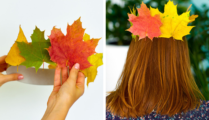 Це одна з найпростіших виробів в садок на тему Осінь. З картону склеюємо ободок по ширині голови, на нього по одному кріпимо листя за допомогою клею або степлера.