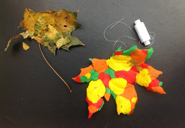 матеріали: кленовий лист, нитки, тісто для ліплення, твердне на повітрі, голка.