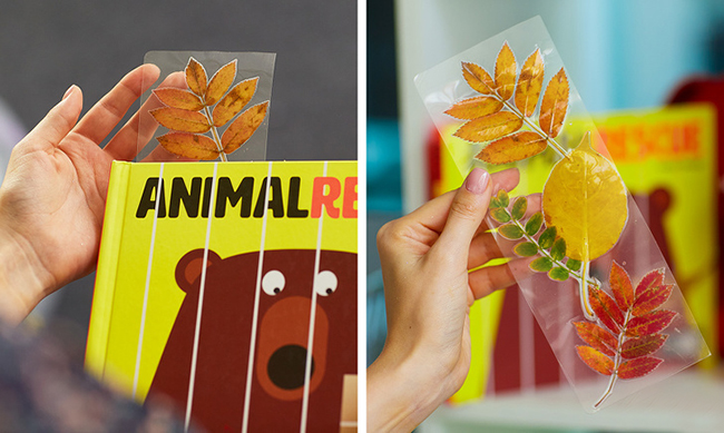 Вирізаємо з плівки два однакових симетричних прямокутника. Розкладаємо на одному прямокутнику листя, накриваємо зверху другим прямокутником і кладемо під рушник, щоб пропрасувати праскою.Через кілька секунд отримуємо готову закладку. Не бійтеся фантазувати: розкладайте листя у вигляді візерунків, фарбуйте їх, створюйте цілі картинки, щоб після термообробки одержати яскраві красиві закладки.