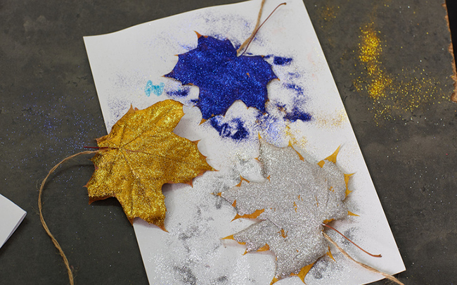 матеріали: осіннє листя, нитки або мотузка, клей ПВА, блискітки, лак для волосся.