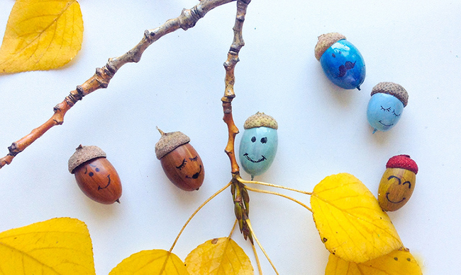 Такі вироби з природного матеріалу для дитячого садка дуже подобаються всім діткам. Робиться така саморобка дуже просто – у зрілих жолудів капелюшки відвалюються, тому спочатку за допомогою універсального клею прикріплюємо капелюшки.При бажанні замість них можна зробити жолудів «волосся» з вовняних ниток або приклеїти помпончик. Змішуємо гуаш і клей ПВА в окремій ємності в співвідношенні 2: 1 і розфарбовуємо жолуді: так фарба буде лягати рівно і не змаститься. За засохлої фарбі малюємо пики за допомогою маркера.