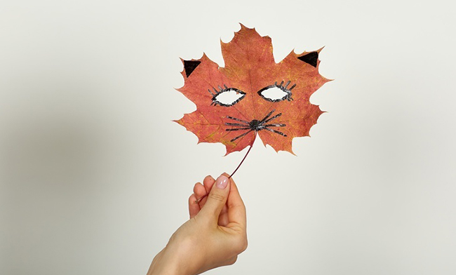 Варіант 1. Щоб зробити просту маску, як на фотографії вище, беремо великий аркуш клена по ширині особи. Моєму його і просушують рушником. Відзначаємо місця для очей і робимо прорізи. За допомогою маркера раскрашиваем лист: щоб вийшов котик або лисичка, досить підмалювати вушка і вусики. Якщо у листочка немає ніжки, маску можна прикріпити на гілочку.