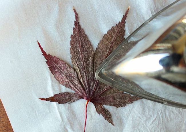 Далі листя потрібно засушити. Це можна зробити, поклавши їх між сторінками книг, а можна пропрасувати праскою, так вони швидше засохне і не будуть згортатися. Після того, як пропрасувати кленовий лист, з бризніть його лаком для волосся, щоб він не кришився. Можна також опускати листя в віск і потім їх сушити, тоді вже вони точно не будуть кришиться.