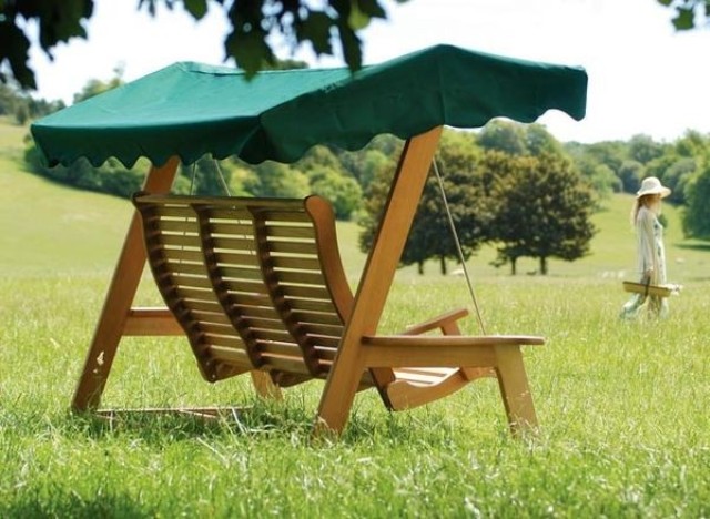 Прекрасним варіантом облаштувати куточок відпочинку є дерев'яні гойдалки, які навіть початківець майстер зможе виготовити самостійно. Їх краще розташувати в тінь дерев і насолоджуватися спокоєм і тишею в комфортних умовах. Зверху бажано покласти невеликий садовий матрац і кілька яскравих подушок для зручності.