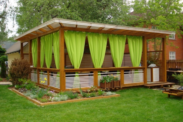 Можна виготовити декоративний навіс з дерева, який вкриє від палючого сонця. Найкраще розташувати його над столом, де будуть збиратися гості, а можна зробити своєрідну перегородку-навіс для літньої грубки.