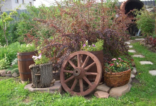 Для цього необов'язково купувати екзотичні рослини. Облагороджування підлягають будь-які звичні рослини. Досить взяти трохи старого посуду, кухонного начиння або меблів, щоб ділянку ожив. Прекрасним варіантом вважається організація квітника на старих возах, в бочках і на сходах.