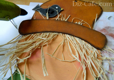 Для прикраси фігури ми використовували сушену траву, якій оформили волосся лякала, гудзик і атласну стрічку, з якої виклали комірець персонажа