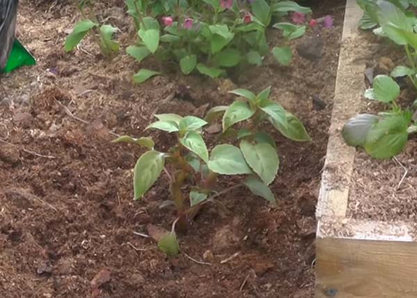 Тепер необхідно витягти саджанці бальзаміну з контейнерів разом із земляною грудкою і акуратно поставити в лунку, присипати грунтом і трішечки втиснути. Не буде зайвим замульчувати посадку тирсою, щоб земля навколо не пересихала і не доводилося її нескінченно поливати. До того ж це додатковий плюс для рослини, тому що коренева шийка замульчувати і тим самим під час полив не будуть розмиватися коріння рослини.